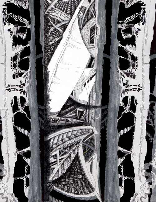 the detail in this is really crazy. it makes my head spin. the only thing i think is distracting is the what appear to be rips in the middle. without them, the piece could be millions of meanings but with them its limited. great job anyways though.